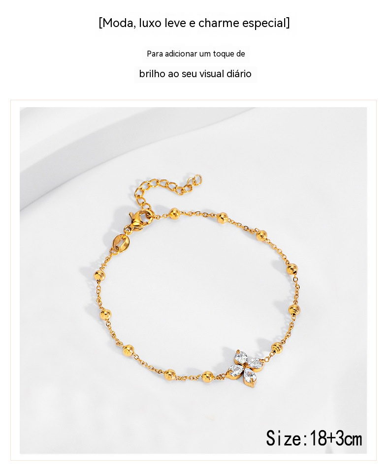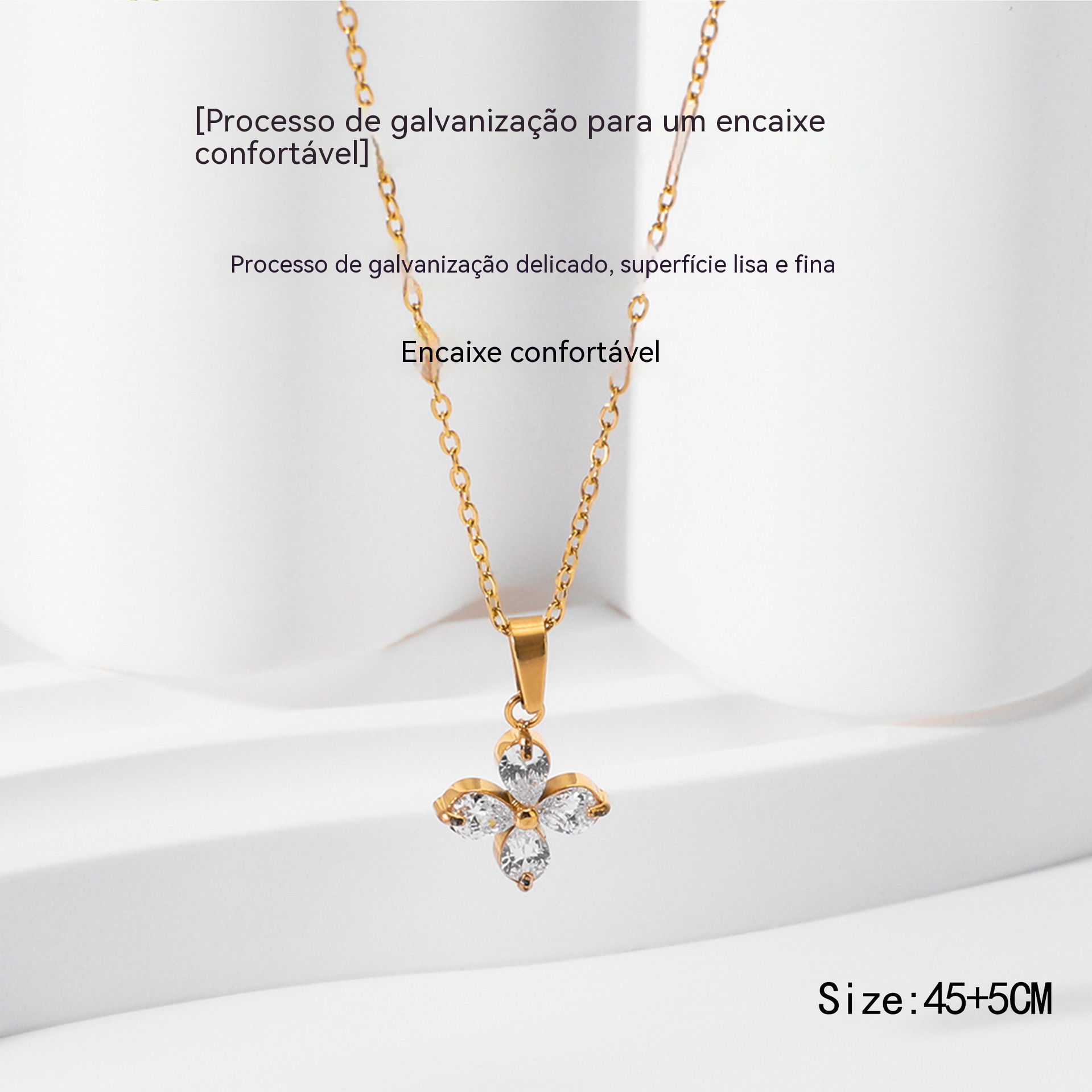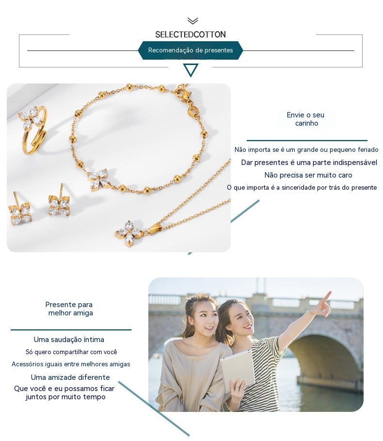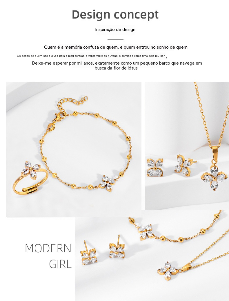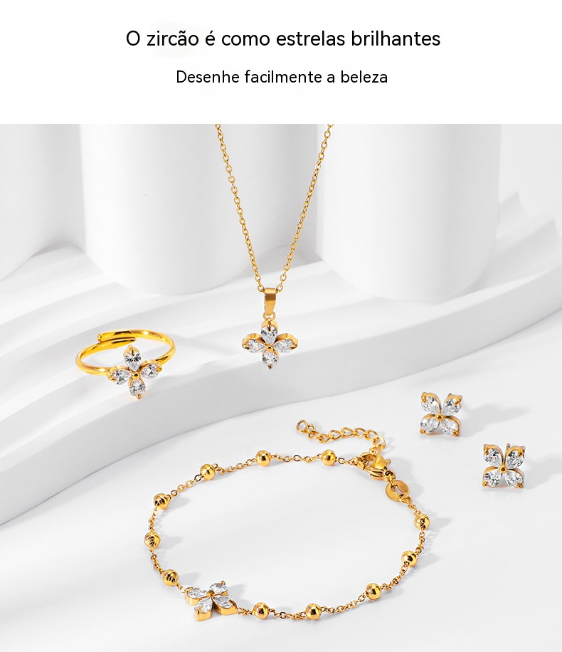 ✨ Brilho suave no pulso e pescoço, para um visual cheio de charme luxuoso ✨Este conjunto de joias de flor com zircônia combina o design delicado de quatro pétalas com zircônias brilhantes, em aço inoxidável banhado a ouro, unindo beleza e praticidade — o toque perfeito para looks casuais, de trabalho ou de encontro.