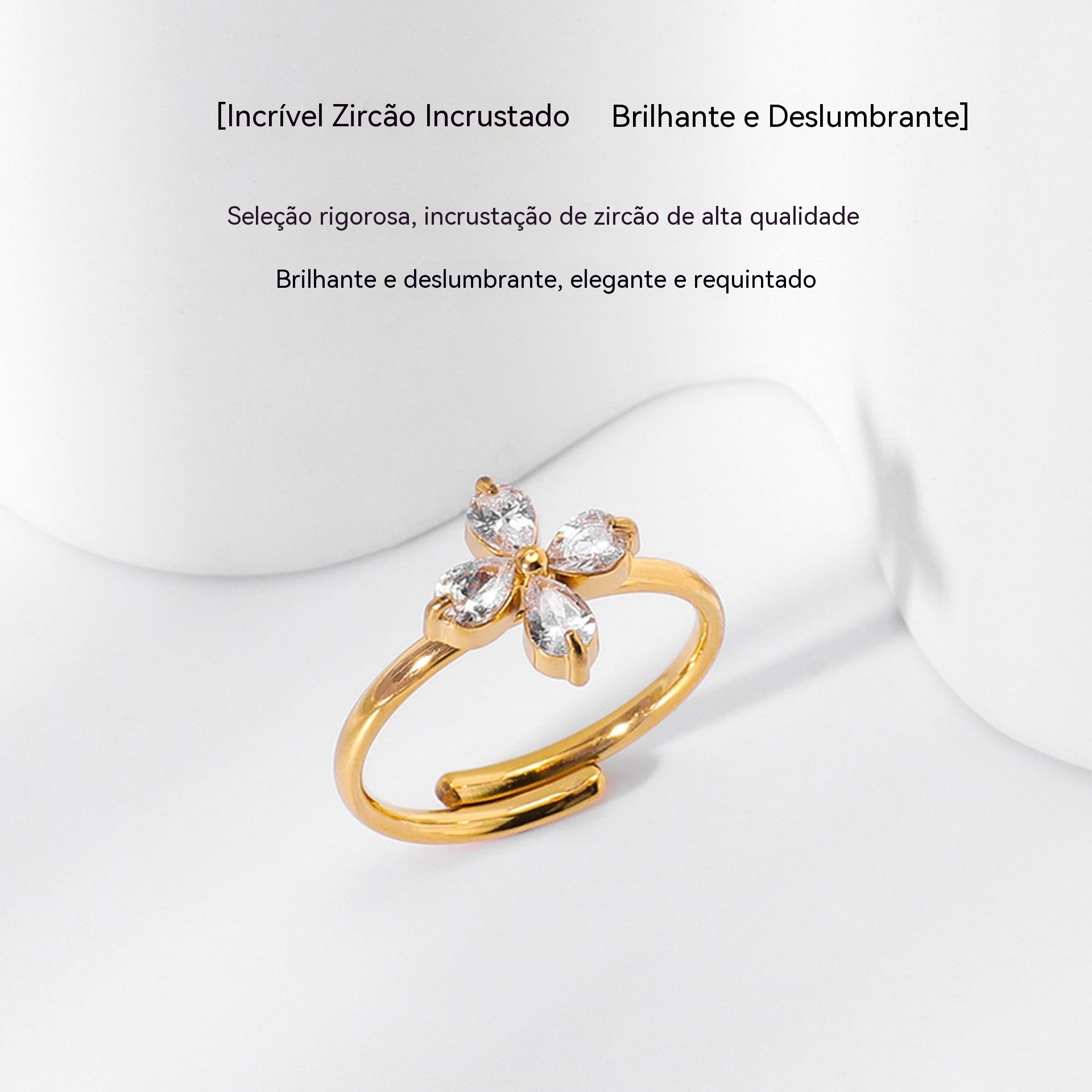- Anel: Modelo aberto ajustável para todos os tamanhos de dedo. O design de flor com zircônia é discreto e brilhante, perfeito para usar sozinho ou com outros anéis.