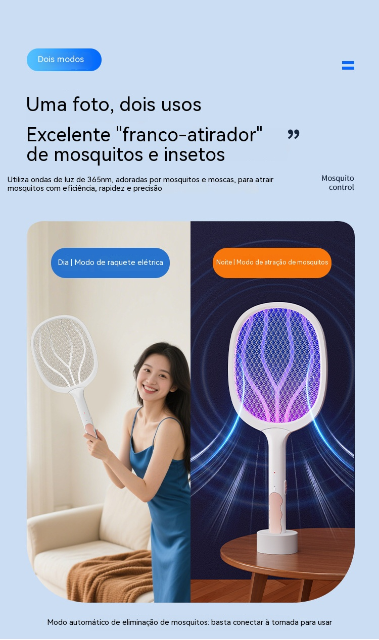 2 em 1: Raquete Elétrica + Luz Anti-Mosquito (Método de Luz Media) Diferente de raquetes comuns, nossa modelo oferece duas formas de eliminar mosquitos: você pode usar a raquete diretamente para bater e choquear os insetos que aparecerem, ou ativar a luz LED (método de luz media) para atrair e matar mosquitos automaticamente, ideal para usar à noite no quarto ou sala, sem precisar ficar vigilante.