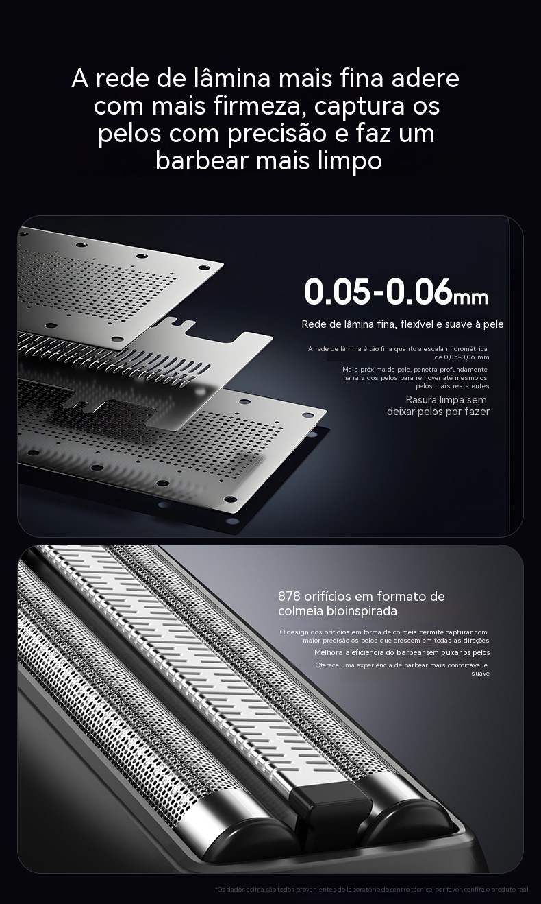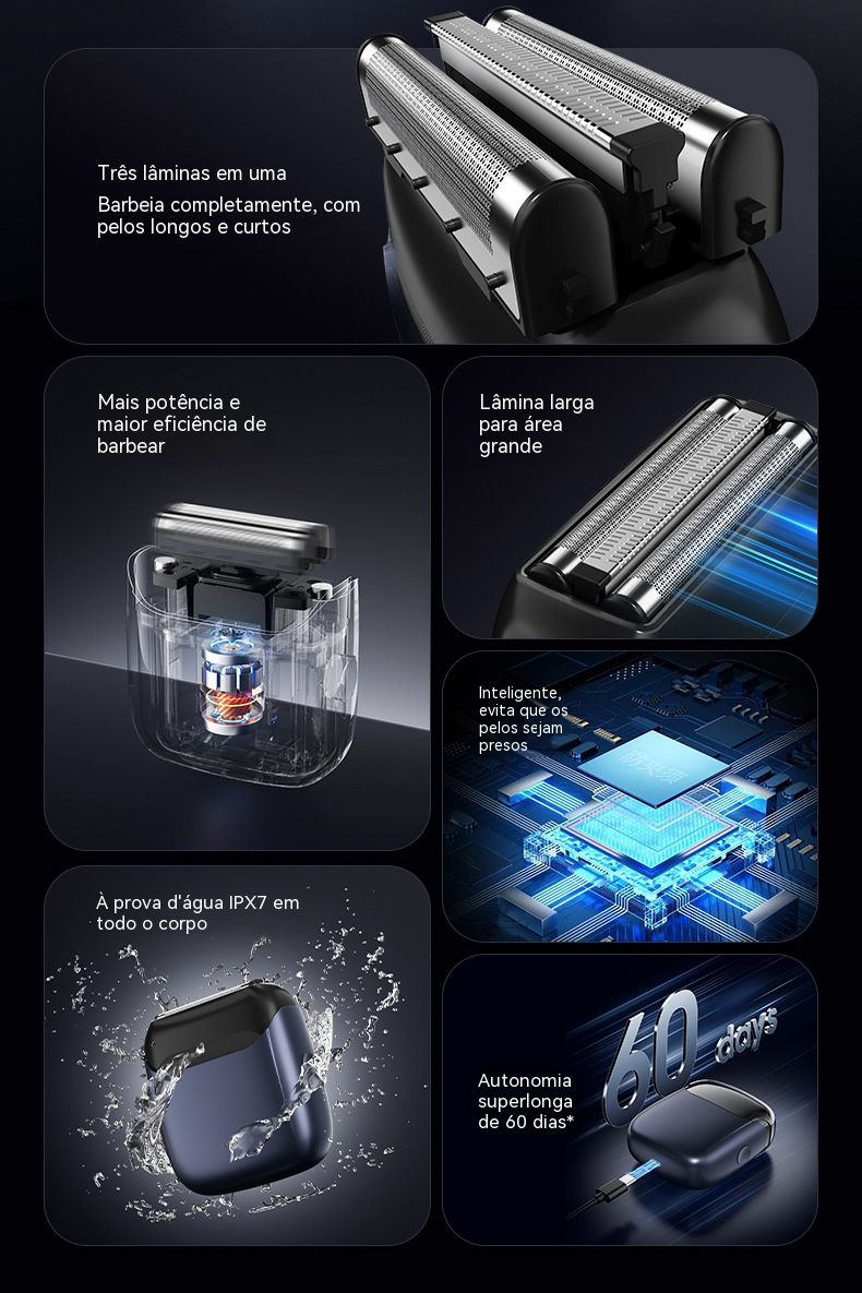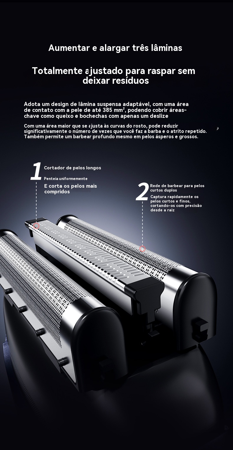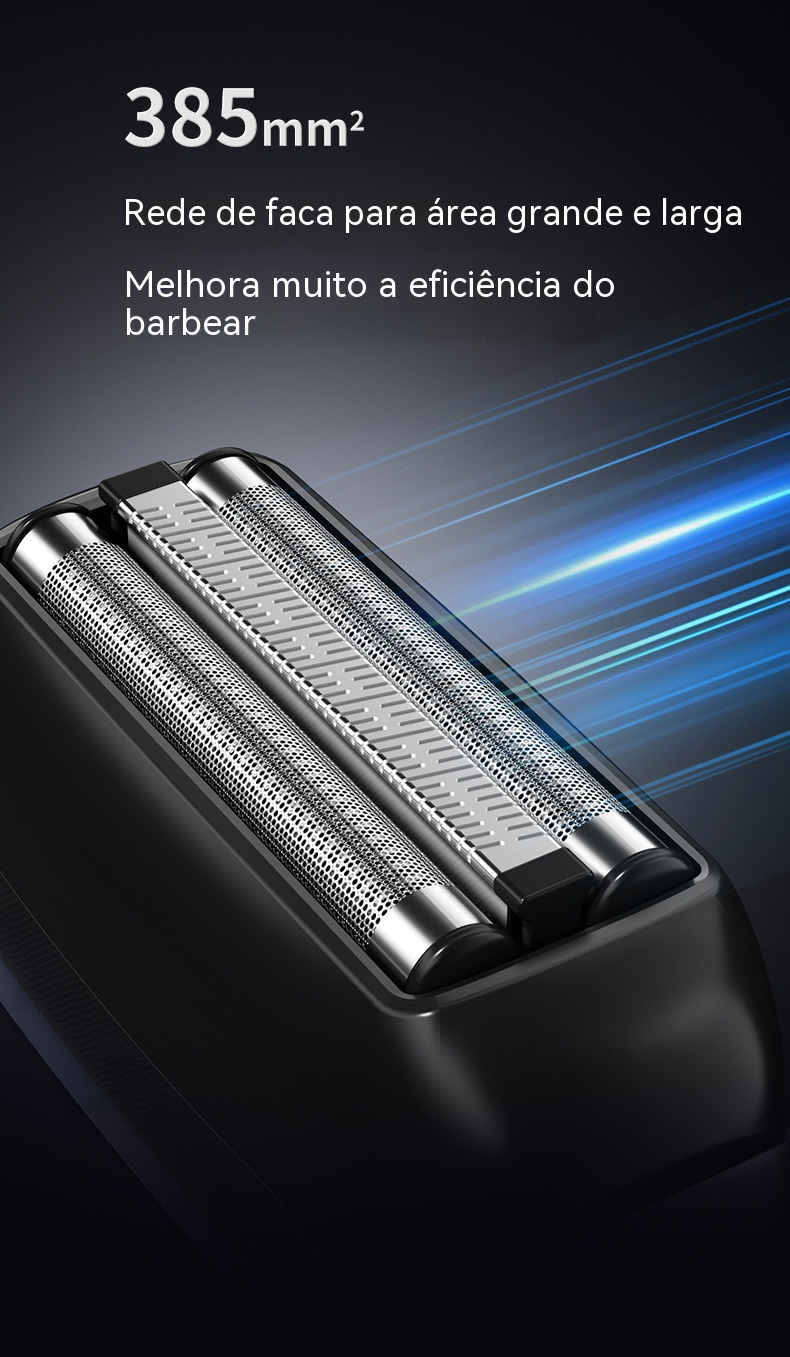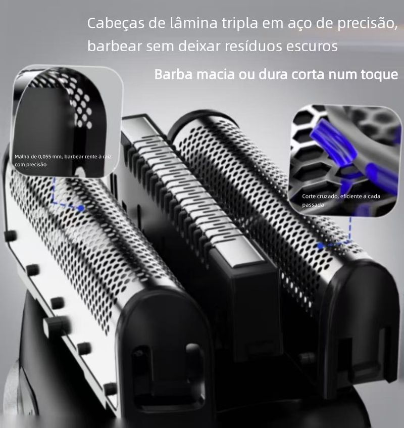 Equipado com lâminas alternativas de alta performance ⚡,se adapta perfeitamente ao contorno do rosto, capturando barbas curtas, longas e cabelos grossos com facilidade. O motor oferece potência estável, fazendo a barba de forma rápida, limpa e suave, sem puxar ou incomodar a pele sensível.