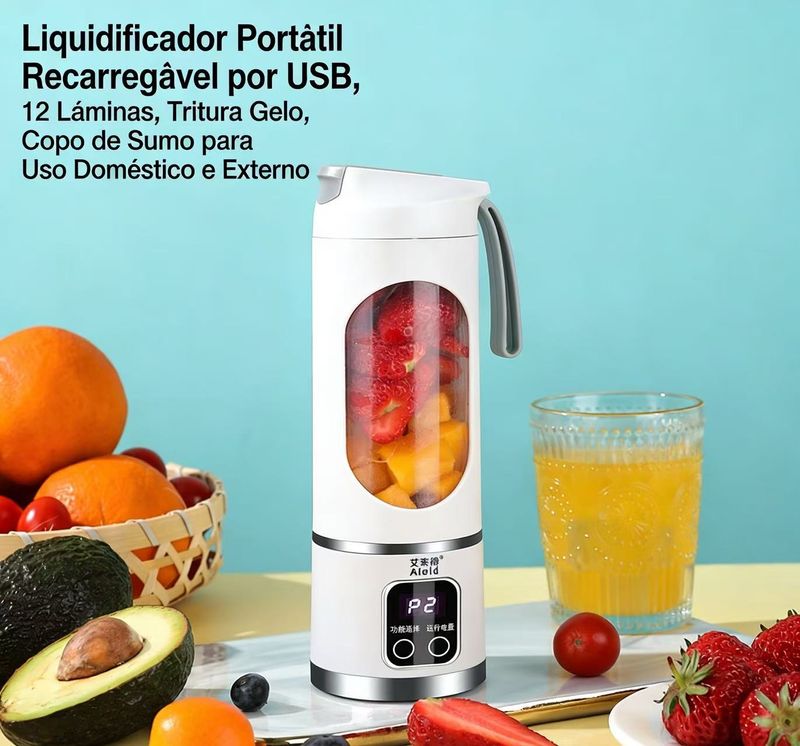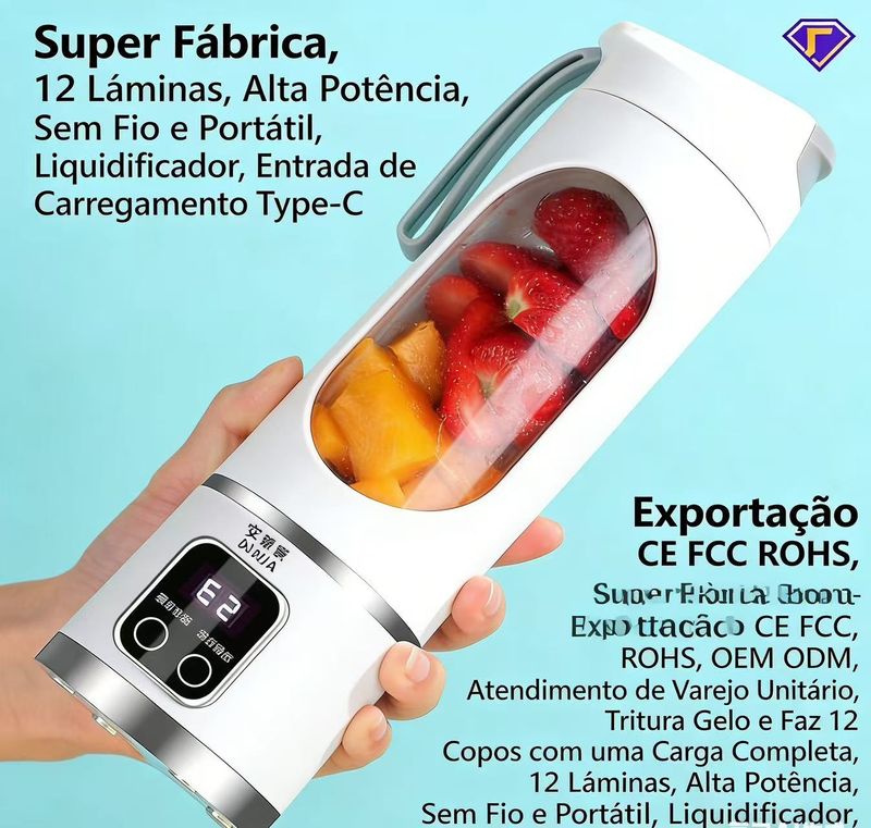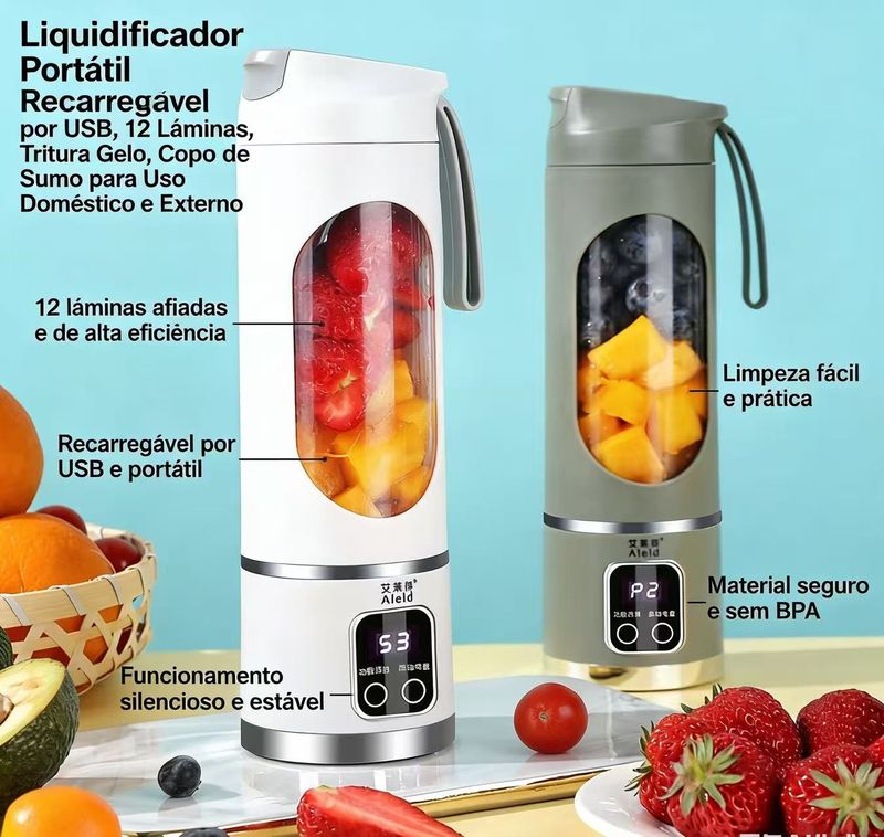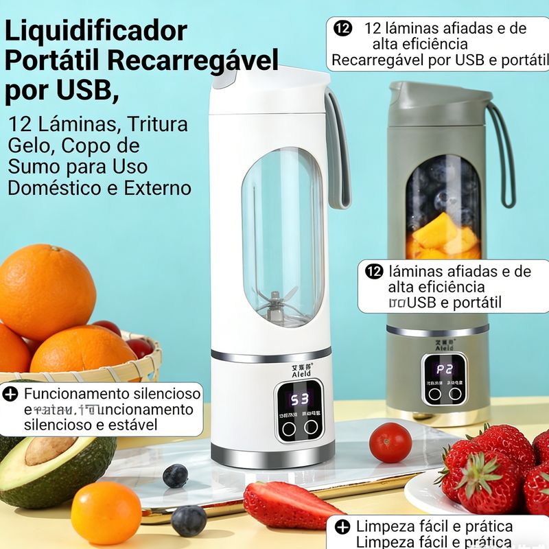 Este liquidificador portátil conta com 12 lâminas de alta eficiência, capaz de triturar gelo, frutas e legumes em segundos, preparando sucos e vitaminas de forma rápida e nutritiva. Com carregamento USB, design leve e compacto, é fácil de transportar para qualquer lugar, seja em casa, escritório ou viagens. Apresenta funcionamento silencioso, limpeza prática, material seguro sem BPA e vedação anti-vazamento, garantindo praticidade e segurança no uso diário. Ideal para quem busca uma vida saudável e prática.